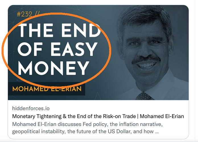 Naturalmente, in aggiunta a quanto dicono Munger e Dalio, ci sono anche le implicazioni dell’inflazione per la “narrativa delle Banche Centrali”: su base quotidiana, da qualche settimana, ci siamo tutti abituati a leggere titoli e frasi come quella dell’immagine qui sotto (“la fine della liquidità abbondante”).