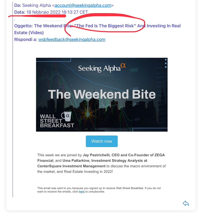 In conclusione di questo nostro contributo in tema Federal Reserve, segnaliamo con l’immagine che segue che per il weekend 19-20 febbraio 2022 il ben noto sito finanziario Seeking Alpha ha proposto il tema seguente: “The Fed Is The Biggest Risk”.