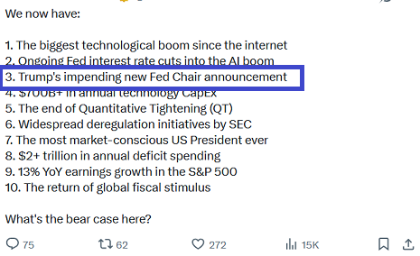 Al punto numero 3, leggiamo che Trump sta per annunciare il nuovo candidato a sostituire Powell alla Federal Reserve (che si chiama Hassett, e di cui Recce’d poi scriverà, ma in una altro nuovo Post)..