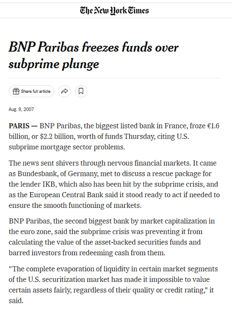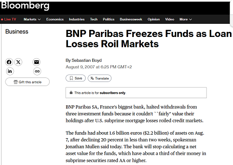 Il 9 agosto 2007 la banca d'investimento francese BNP Paribas annunciò la chiusura di tre fondi di investimento, il che significava che chi vi aveva investito non poteva più ritirare il proprio denaro.
