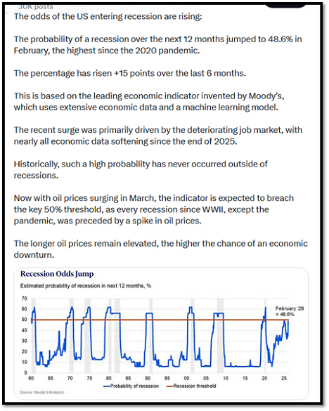 Secondo El-Erian, il rischio di recessione continuerà ad aumentare finché la guerra si protrarrà. Ha sottolineato la possibilità di un ulteriore aumento dei prezzi del petrolio qualora le interruzioni delle forniture in Medio Oriente dovessero persistere, e il rischio di stagflazione, uno scenario peggiore per i mercati finanziari in cui la crescita rallenta mentre l'inflazione continua a salire
