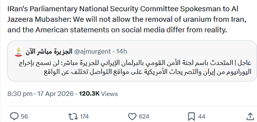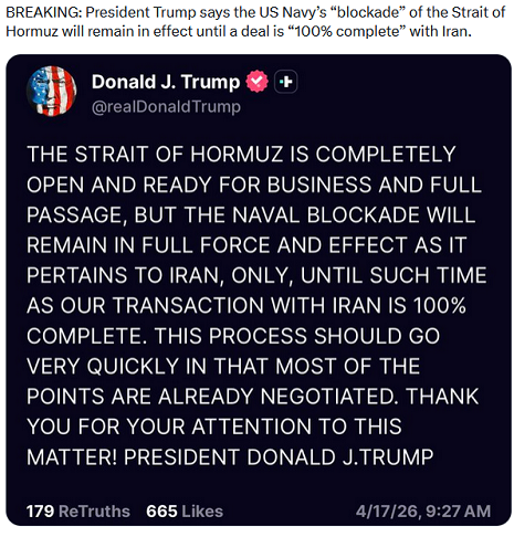 Ritorniamo indietro di 24 ore, al pomeriggio del venerdì 17 aprile, e precisamente ad ad un’ora e 15 minuti dalla apertura di Wall Street (l’orario era stato concordato, così come il testo che leggete nell’immagine sotto): accade che il Governo dello IRAN pubblica questo Post. L’orario che leggete nell’immagine era stato posto come condizione per il proseguimento delle trattative proprio dalla Amministrazione Trump, ed il solo scopo era quello di manipolare le menti della massa degli investitori, come vedremo più sotto.