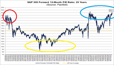 È utile comprendere i meccanismi di base del rapporto P/E. La versione più utile, il P/E prospettico, misura il prezzo delle azioni di un'azienda rispetto agli utili che gli analisti di Wall Street prevedono in media per l'azienda nel prossimo anno. Al suo picco di ottobre, il rapporto P/E dell'S&P 500 era superiore a 23.