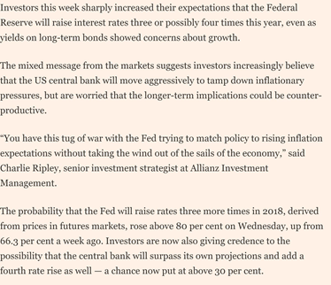 I rendimenti dei Treasuries a 10 anni avevano già sfiorato in precedenza il 3% a scadenza, nel corso del 2018, e poi erano tornati verso il basso. Non si può escludere che il test vada fallito anche questa seconda volta. Importante però capire che questa volta è diverso ... nel senso che sono diverse le motivazioni che fanno scendere i prezzi delle obbligazioni nell'aprile 2018. Lo leggete chiaramente sopra, nel brano del Financial Times.