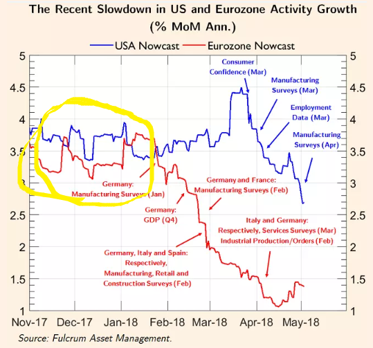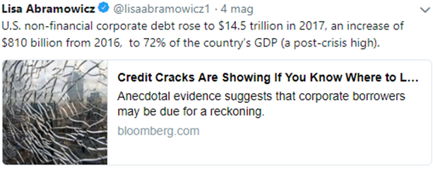 Oggi negli USA la situazione è quella che vedete sotto: il debito delle Società è pari al 5,35% del Prodotto Nazionale, era il 3,2% nel 2013. In Europa, lo ripetiamo, è peggio di così.