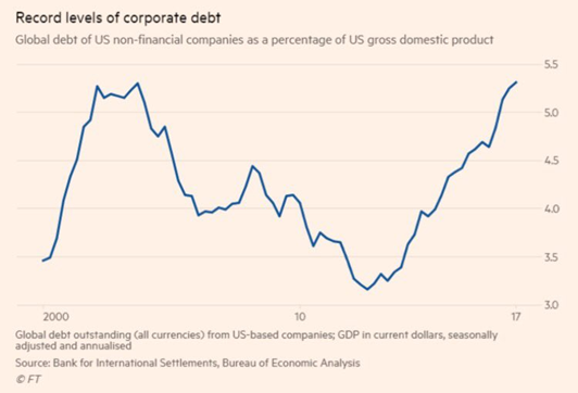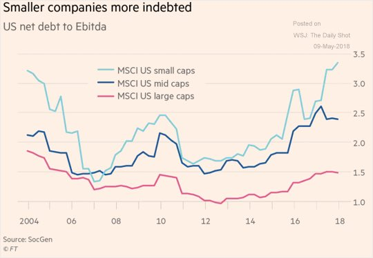 Nel primo grafico del Financial Times, vedete dati che hanno bisogno di pochi commenti. Il rapporto tra debito delle Aziende ed utili prima delle tasse delle medesime Aziende è cresciuto, negli ultimi cinque anni, del 50% se prendiamo in considerazione solo le Società più grandi. Se prendiamo in considerazione le piccole Società, le cosiddette "small caps", l'incremento è del 100%.