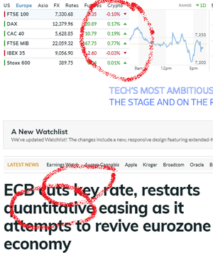 Un vero e proprio bagno di indifferenza: l’indifferenza generale ha accolto sia la conferenza stampa di draghi, giovedì 12 settembre, sia la reazione dei mercati venerdì 13 settembre. Le chiusure delle Borse europee, giovedì 12, sono state una sentenza: e lo vedete sopra, dove a un titolo enorme si accompagnano però numeri infimi.