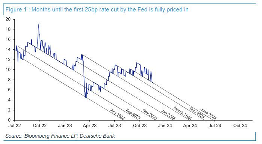Dal mese di luglio dello scorso anno, ovvero da 16 mesi, secondo l’industria del risparmio che sta intorno al mercato, il numero di mesi che mancano al primo taglio dei tassi ufficiali da parte della Federal Reserve è sempre rimato dentro all’intervallo tra 6 e 20.