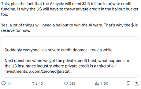 (19/11 06:35) Private credit, finanziamenti diretti, economia reale: ma almeno vi informano? (3) Davvero ci sarà, alla fine, il “salvataggio di Stato”? Ed a quali prezzi?Diciamo 70 su 100?Oppure 50? Valter BuffoNovember 19, 2025 Facebook0 Twitter LinkedIn0 Reddit Tumblr