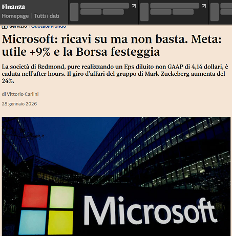 (30/01 07:50) Le trimestrali rimettono in moto le Borse? (1) Il fatto di ieri, in Borsa, è la reazione del mercato alla trimestrale di Microsoft.Davvero, come sostengono alcuni, il titolo Microsoft adesso è “dead money”?. Valter BuffoJanuary 30, 2026 Facebook0 Twitter LinkedIn0 Reddit Tumblr
