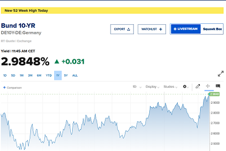 Ma voi lo sapete che questa mattina, proprio questa mattina, il rendimento del Bund tedesco a 10 anni sta ai massimi degli ultimi 12 mesi?