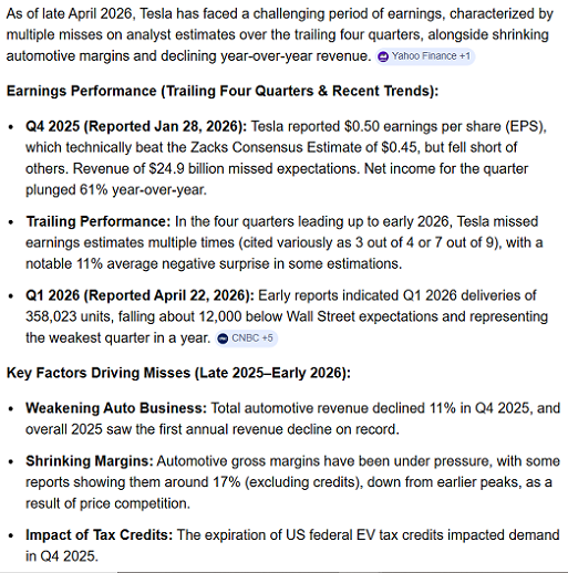 (22/04 08:20) Tesla tonight (1) Quattro trimestri consecutivi di risultati superiori alle attese.Perché le attese sono sempre così alte?E voi lettori che stime avete fatto per stasera? Valter BuffoApril 22, 2026 Facebook0 Twitter LinkedIn0 Reddit Tumblr