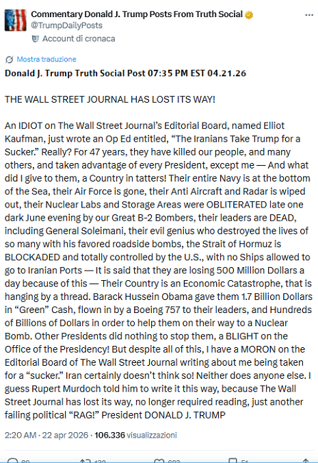 (22/04 11:20) Tanto così, per ridere un po' (2) Un tweet, un altro tweet, un ennesimo tweet.Ci voleva proprio.E dire che, una volta, il Capo di Stato era una figura … Valter BuffoApril 22, 2026 Facebook0 Twitter LinkedIn0 Reddit Tumblr