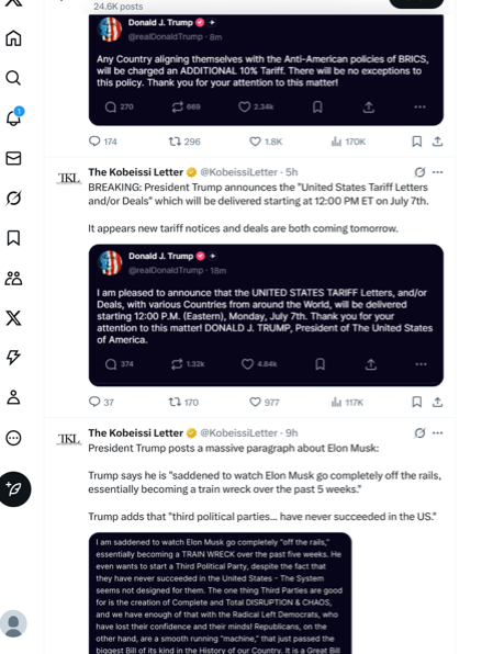 Dei tre che vedete nell’immagine, quello che per Recce’d ha maggiore influenza sui mercati è proprio il terzo: nel quale Trump si dilunga a motivare la sua rottura con Elon Musk.