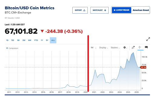 Noi investitori siamo chiamati a risponde anche a questa domanda: per quale ragione il Bitcoin valeva 5000 dollari prima della pandemia e vale 67000 dollari oggi? Che cosa c’entra una pandemia globale con il Bitcoin? Che cosa c’entra un evento sanitario globale con le cryptovalute? Questo nel grafico è un aumento di valore oppure si tratta semplicemente di una illusione? Il valore rimane tutto sulla carta?